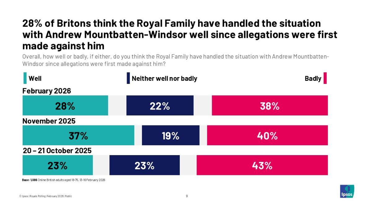 Личный рейтинг одобрения Эндрю составляет всего 5%. Его брат, король Чарльз, 77 лет, имеет 48% положительных оценок, в то время как только 47% респондентов положительно относятся к королевской семье в целом. Лишь 46% считают, что Чарльз хорошо справляется с ролью монарха — это падение с 54% в ноябре. И только 28% верят, что королевская семья хорошо справилась с ситуацией вокруг Эндрю, по сравнению с 37% три месяца назад.